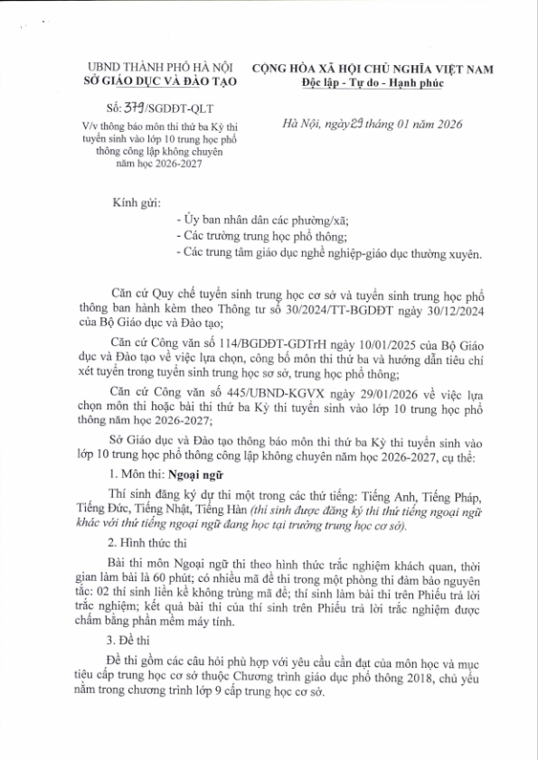 Hà Nội thông báo môn thi thứ ba Kỳ thi tuyển sinh vào lớp 10 THPT công lập không chuyên năm học 2026-2027